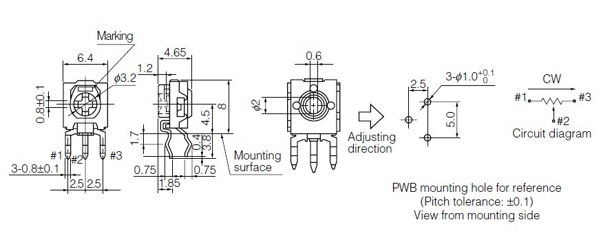 EVND2AA03B53 Specifications: (1)Nominal Total Resistance: 1 kΩ to 1 MΩ; (2)Residual Resistance: 1 kΩ<R<2 kΩ: 60Ω max; (3)Rotation Angle: 210 °±20 °; (4)Rotation Torque: 2 mN·m to 25 mN·m; (5)Stopper Strength Surface: 75 mN·m, reverse side: 35 mN·m; (6)Operating Life: 100 cycles; (7)Resistance to Soldering Heat: 240 ℃ to 280 ℃: 5 s max., 280 ℃ to 300 ℃: 3 s max.; (8)Endurance under High Temperature: 70 ℃±3 ℃ After 250 hours +5 %, -15 %.